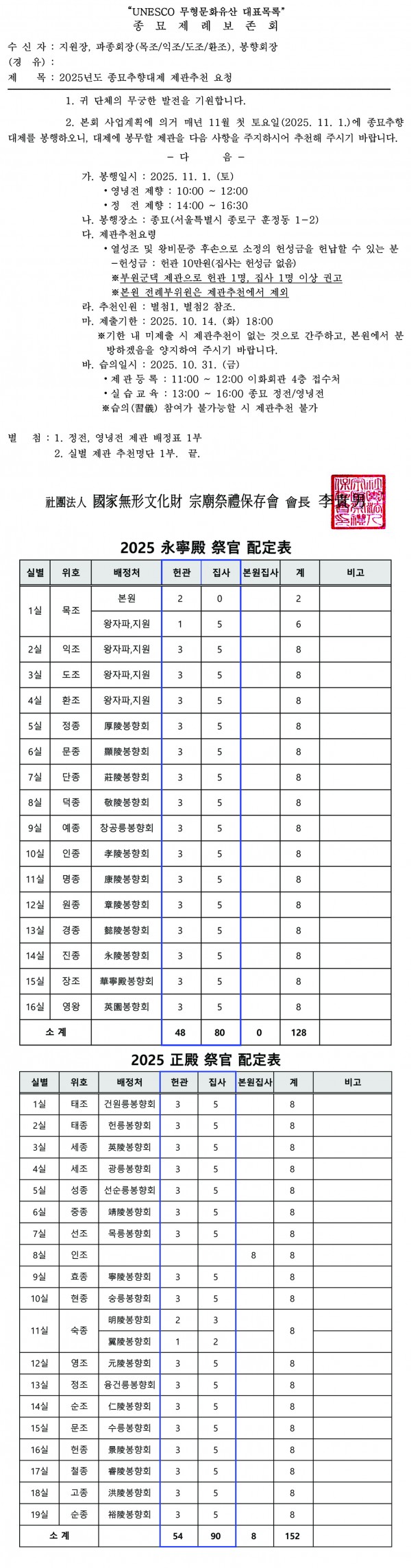 2025년도 종묘추향대제 제관추천 요청